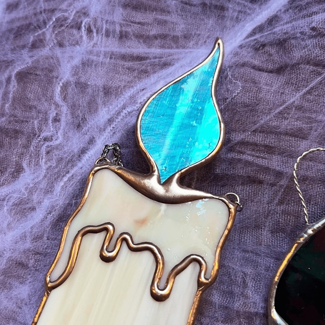 Chandelle à la flamme turquoise iridescente d’aspect holographique.
