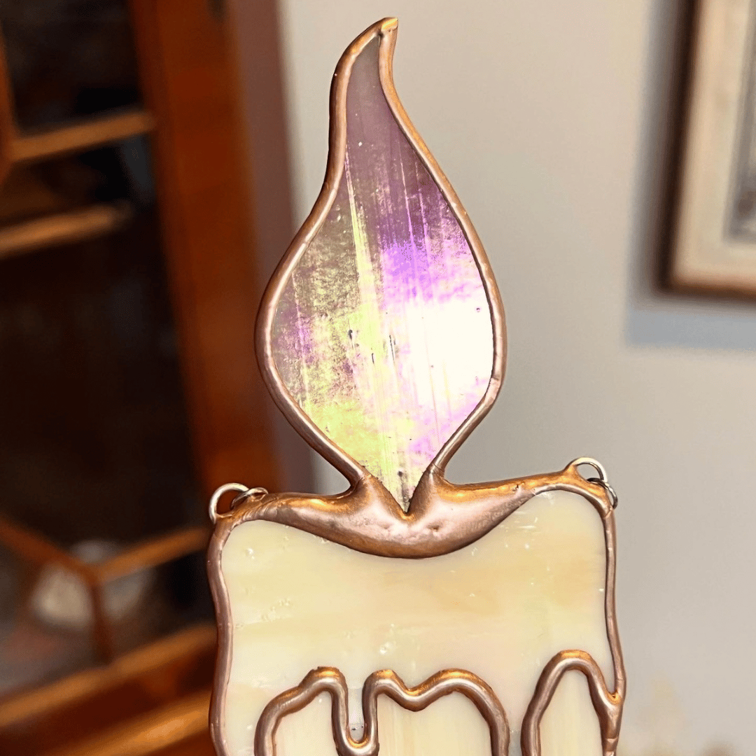 Du verre irisé souligne la flamme et imite la cire fondue.