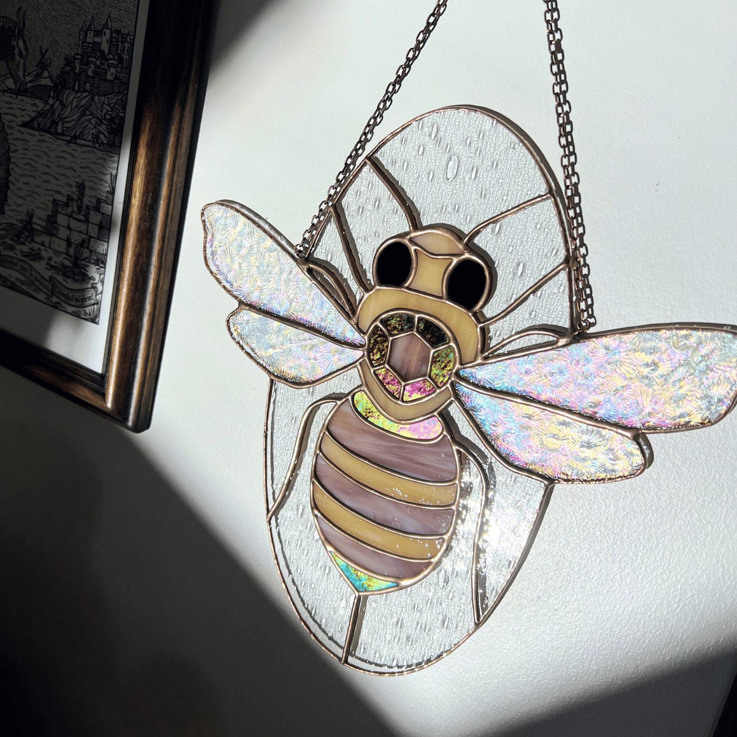 Grande reine abeille aux ailes florales irisées (couleur changeante en fonction de la luminosité). Couleurs opalescentes rose et ambre. Verre noir irisé et verre transparent texturé.