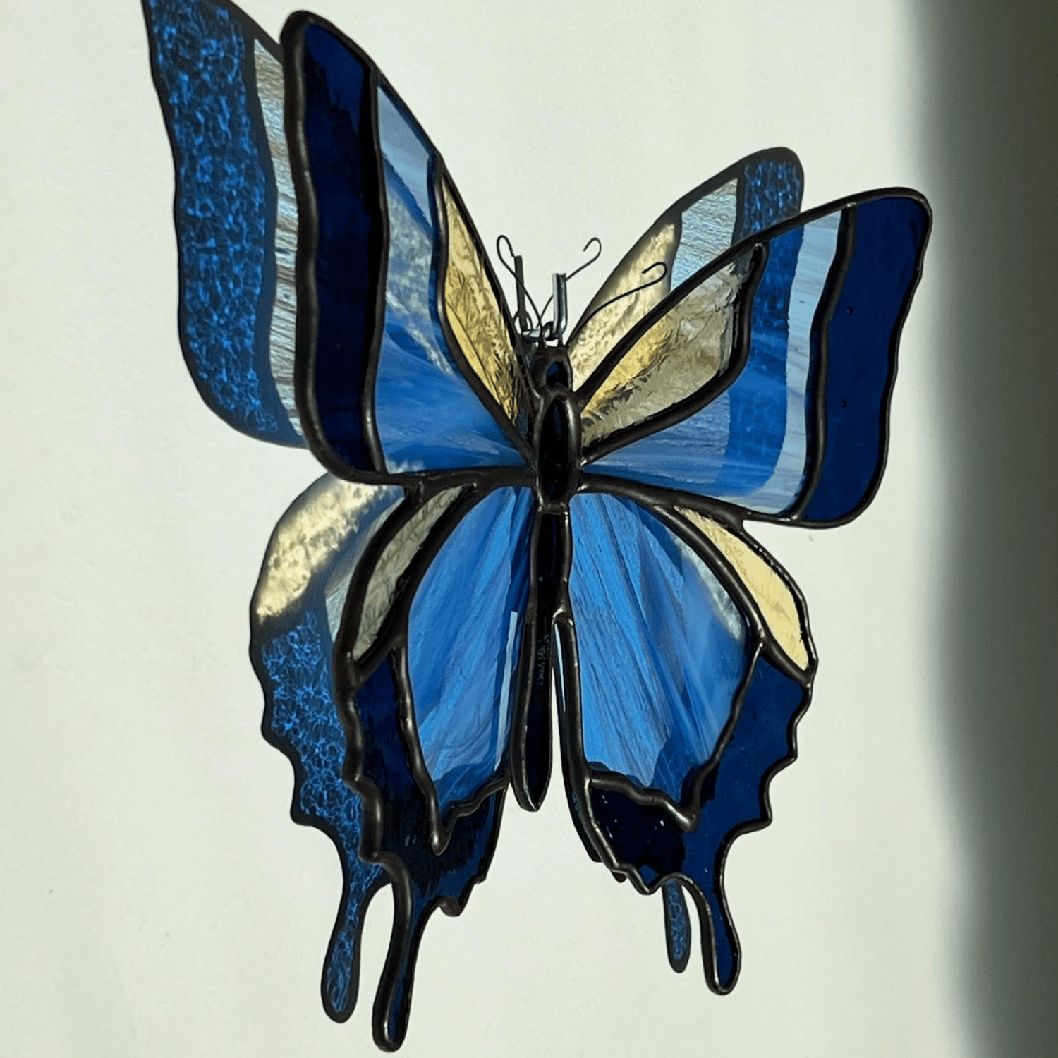 Papillon céleste mêlant verres translucides bleu et jaune.