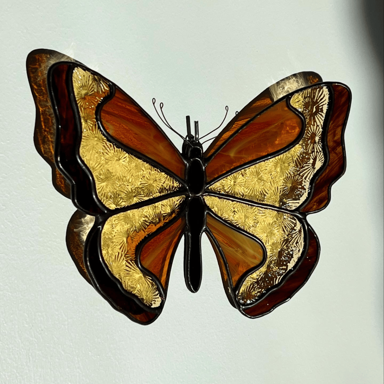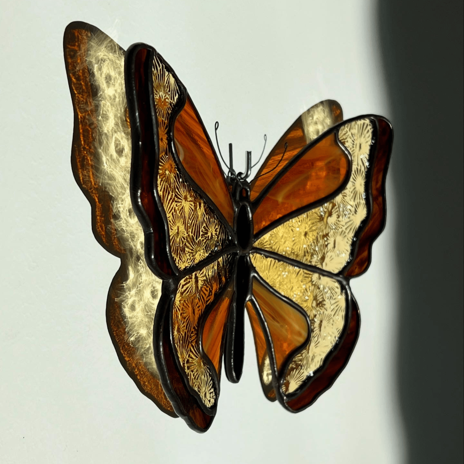 Papillon de feu mêlant verres translucides orange, jaune et marron.