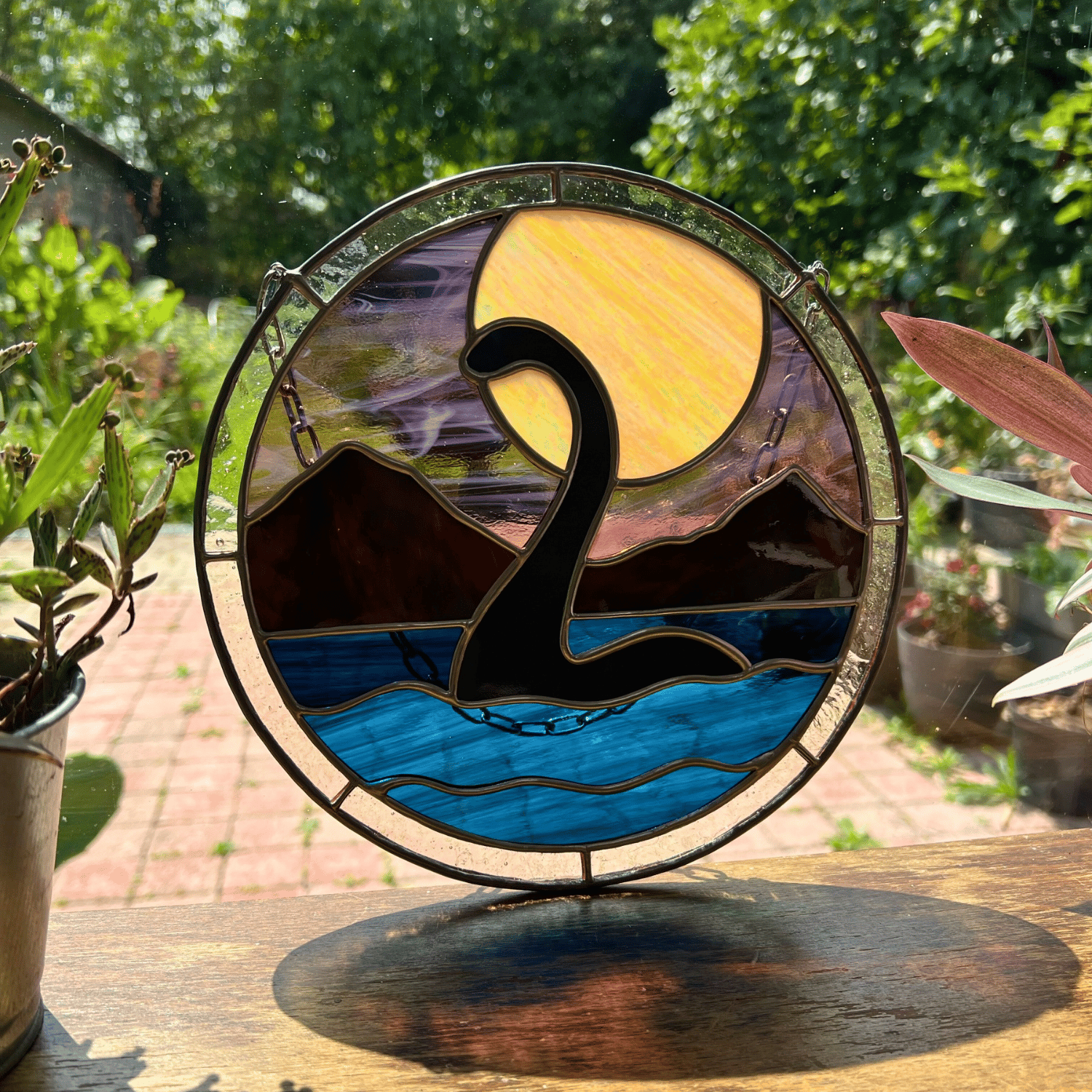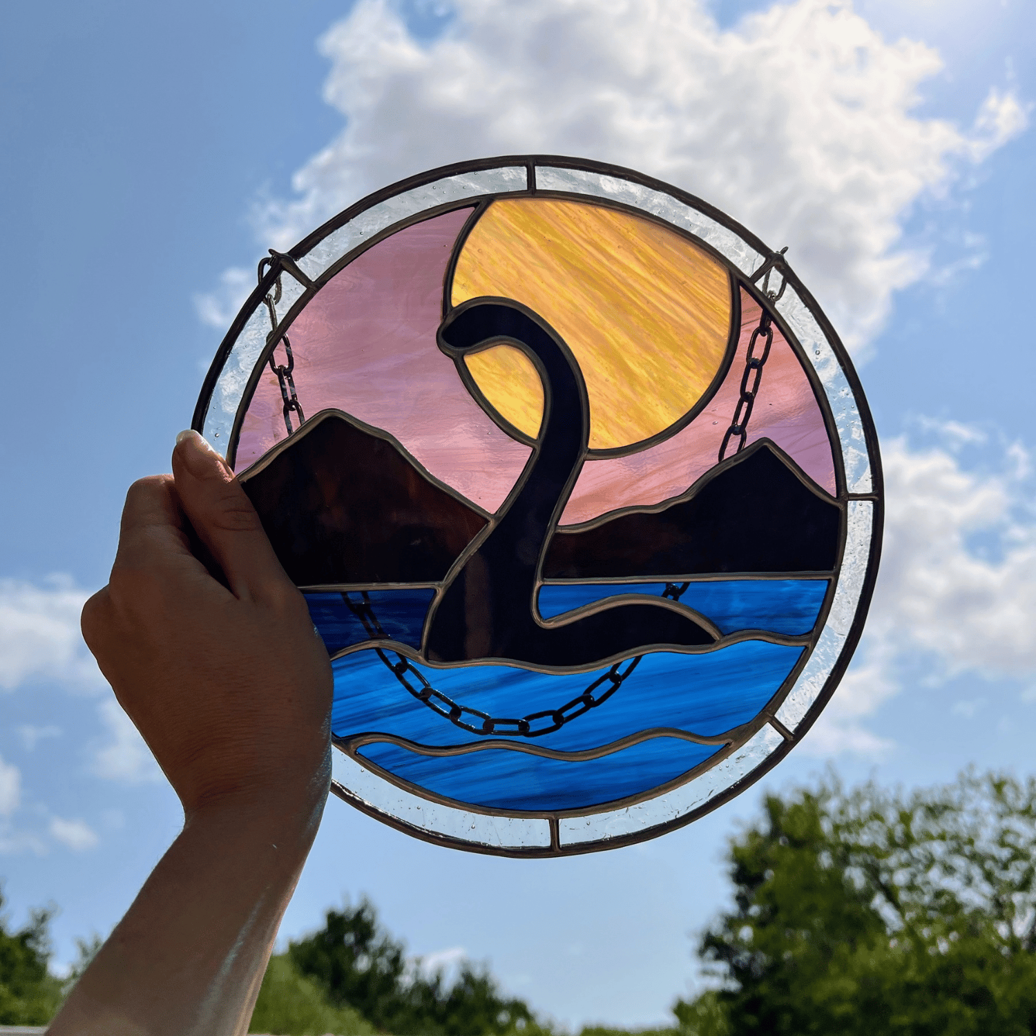 Avec une chaîne en inox pour suspendre le vitrail.