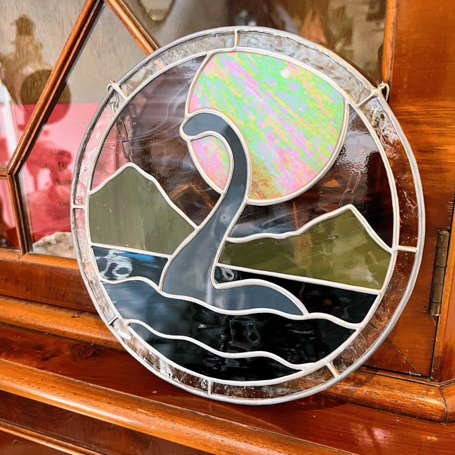 Nessie est entourée de différents verres translucides ainsi que de la lune crée à partir d’un verre jaune iridescent (couleur et nuances changeantes en fonction de la luminosité et de l'angle de vue).